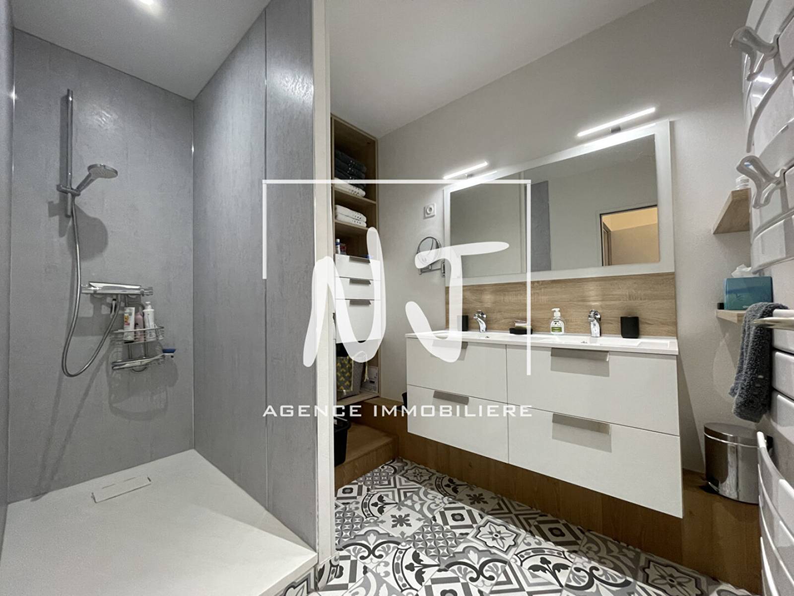 Il offre une vaste entrée, un salon séjour lumineux avec une triple baie sur le balcon, une cuisine Mobalpa entièrement aménagée et équipée avec une grande arrière cuisine, un coin nuit qui propose deux chambres avec dressing et balcon, une salle d'eau Mobalpa avec douche italienne, double vasques et coin lingerie, toilettes suspendues séparées.