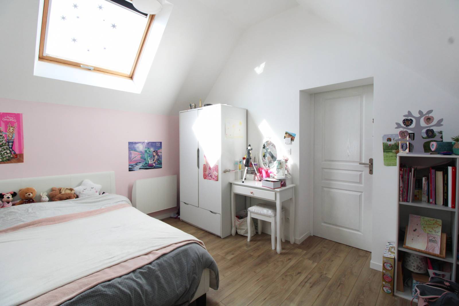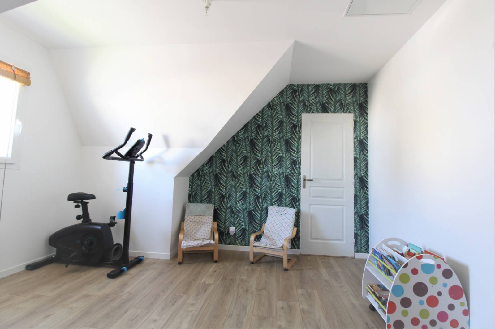 A l'étage une mezzanine spacieuse dessert 3 chambres, une salle de bains et un WC.