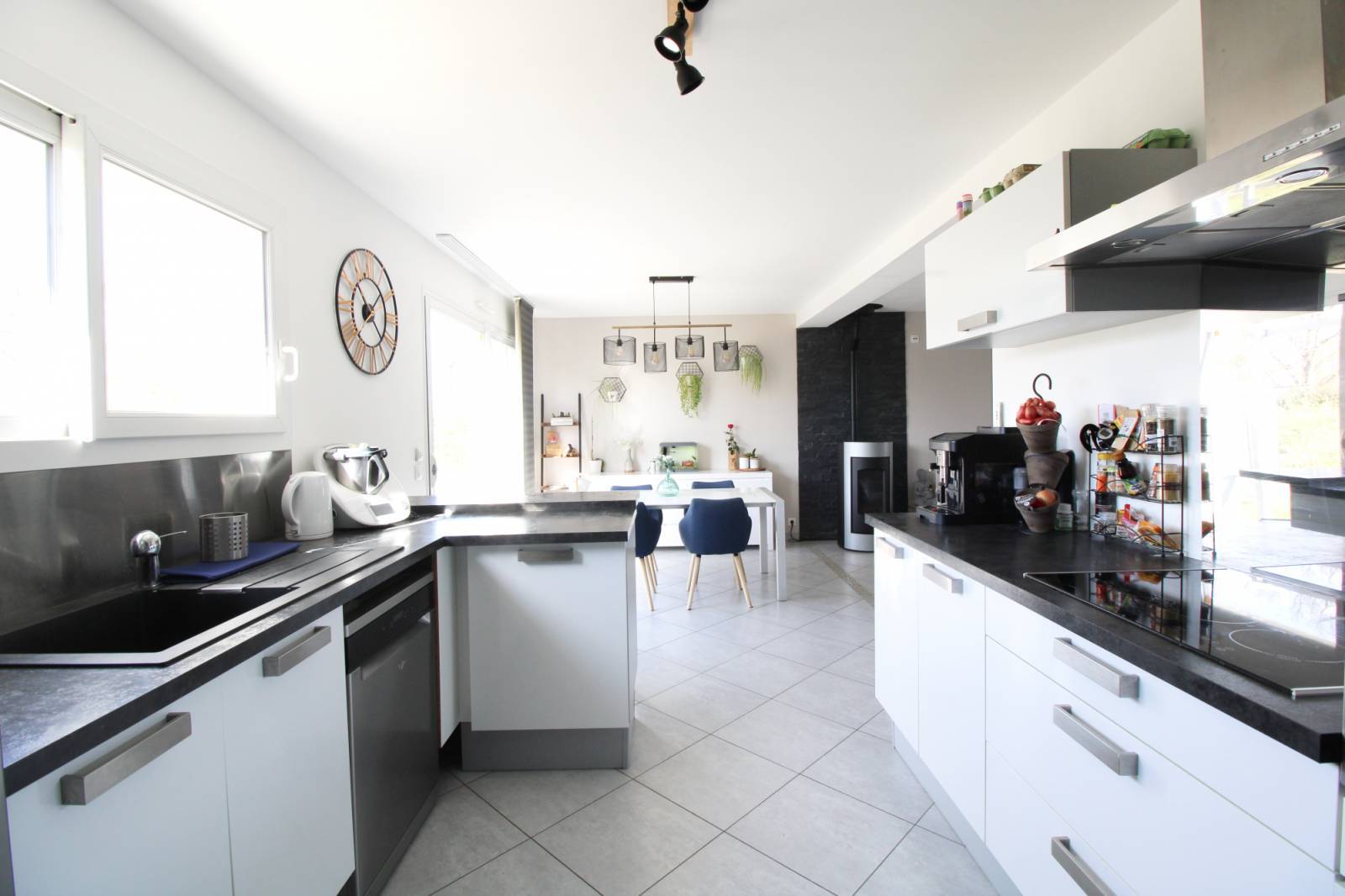Vous y trouverez au rez-de-chaussée un salon séjour ensoleillé avec un poêle à granulés, une cuisine ouverte aménagée et équipée, une arrière cuisine, une suite parentale avec salle d'eau privative, un WC, et des rangements.