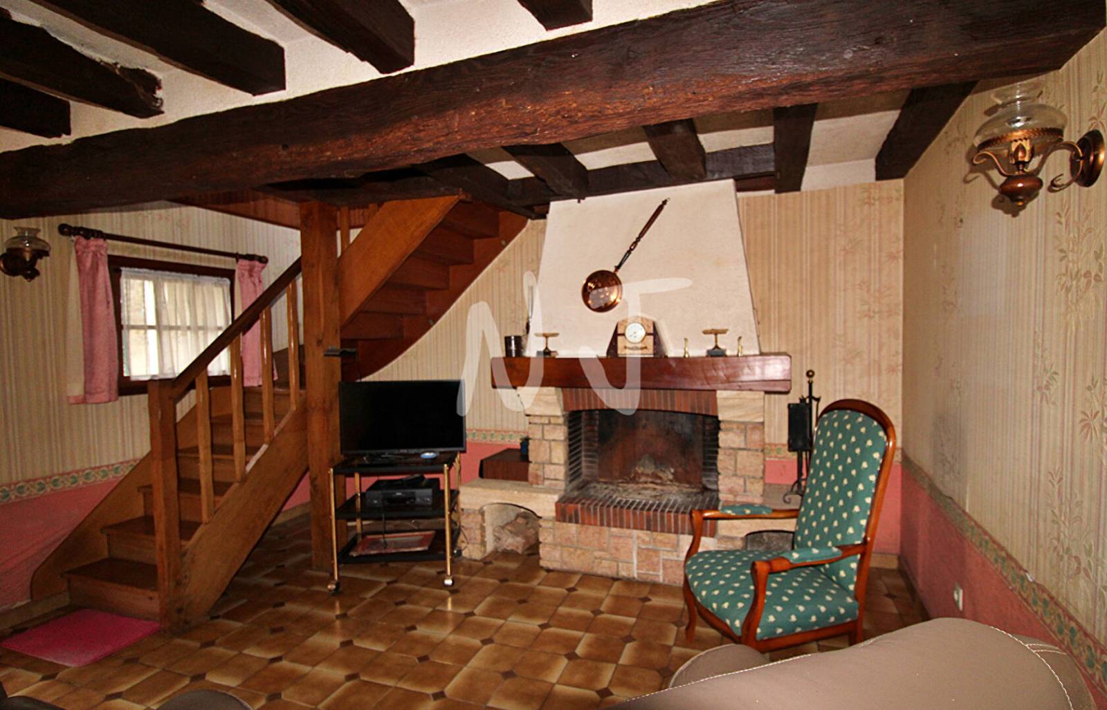 Au rez de chaussée, vous découvrez une cuisine indépendante de 23 m², une salle de douche, poutres apparentes dans le salon et le séjour, cheminée avec insert.
